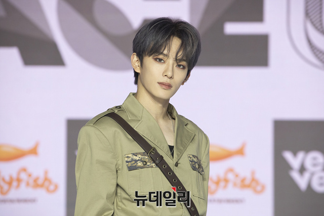 아이돌그룹 '베리베리(VERIVERY)' 멤버 강민이 13일 오후 온라인으로 진행된 5번째 미니앨범 'FACE US(페이스 어스)' 쇼케이스에서 포토타임을 갖고 있다.