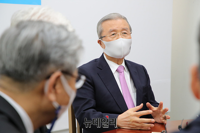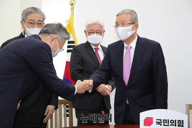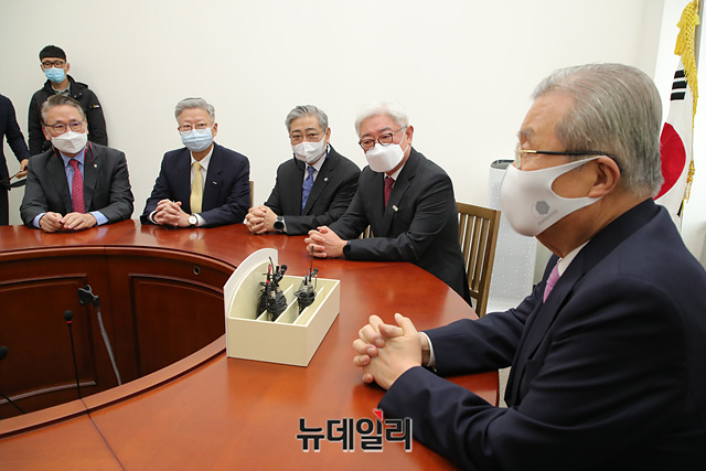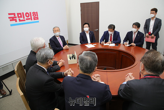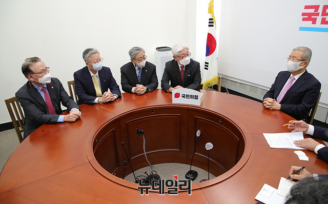 김종인 국민의힘 비상대책위원장이 13일 오후 국회에서 김영모 인하대의료원장, 김연수 서울대병원장, 윤동섭 연세대의료원장, 김영훈 고려대의료원장등 주요 대학병원장들과 면담을 갖고 의대생들의 국가고시 재응시 문제에 대해 대화를 나누고 있다. (사진=국민의힘)