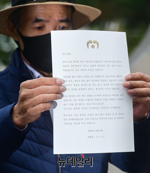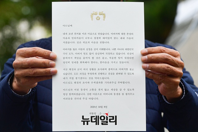 다음은 문재인 대통령이 보낸 편지 전문이다.아드님께내게 보낸 편지를 아픈 마음으로 받았습니다. 아버지에 대한 존경의 마음과 안타까움이 너무나 절절히 배어있어 읽는 내내 가슴이 저렸습니다. 깊은 위로의 마음을 전합니다.아버지를 잃은 아들의 심정을 깊이 이해합니다. 나뿐 아니라 대한민국 국민 모두, 아버지 일로 많이 상심하며 걱정하고 있습니다. 진실이 밝혀져서 책임을 물어야 할 것은 묻고, 억울한 일이 있었다면 당연히 명예를 회복해야 한다는, 한마음을 가지고 있습니다.지금 해경과 군이 여러 상황을 조사하며 총력으로 아버지를 찾고 있습니다. 모든 과정을 투명하게 진행하고 진실을 밝혀낼 수 있도록 내가 직접 챙기겠다는 것을 약속드립니다.아드님도 해경의 조사와 수색결과를 기다려주길 부탁합니다.아드님과 어린 동생이 고통을 겪지 않고 세상을 살 수 있도록 항상 함께하겠습니다. 강한 마음으로 어머니와 동생을 잘 챙겨주고 어려움을 견뎌내 주길 바랍니다.2020년 10월 8일대통령 문재인