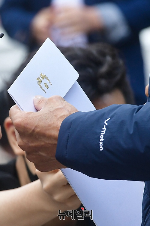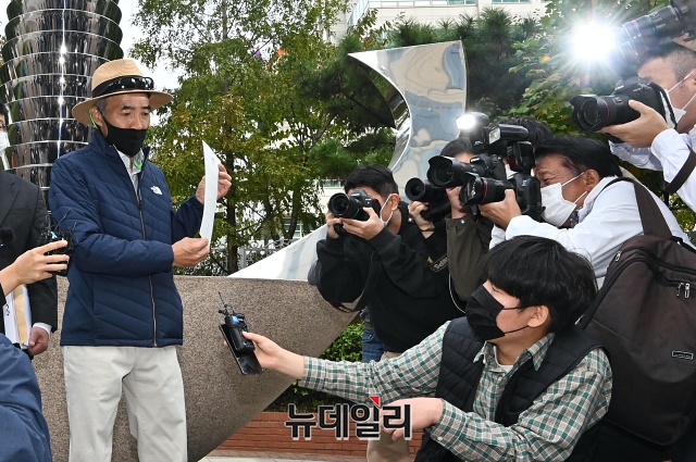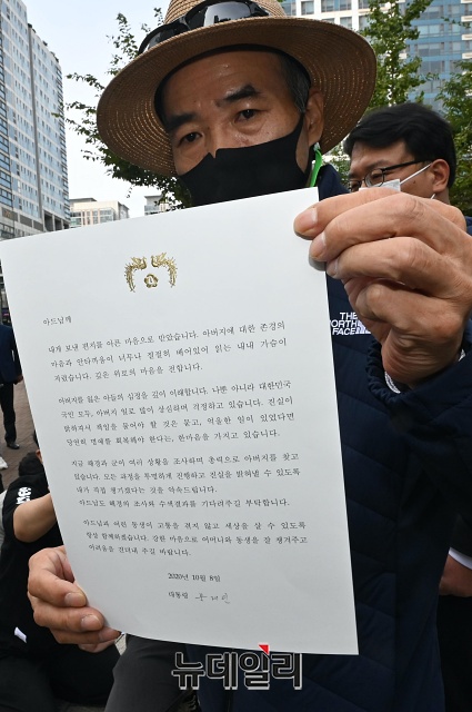 북한 피격사망 공무원 A씨의 형 이래진씨가 14일 오후 인천 연수구 해양경찰청 앞에서 열린 '해양경찰청 정보공개청구 기자회견'에서 문재인 대통령이 A씨 아들에게 보낸 답장을 공개하고 있다. (인천=권창회 기자)
