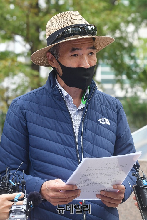 북한 피격사망 공무원 A씨의 형 이래진씨가 14일 오후 인천 연수구 해양경찰청 앞에서 열린 '해양경찰청 정보공개청구 기자회견'에서 발언하고 있다.