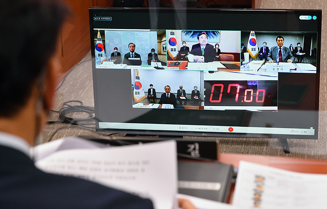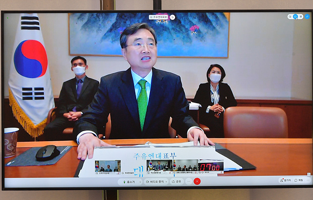 [포토] 영상으로 업무보고하는 조현 유엔대사