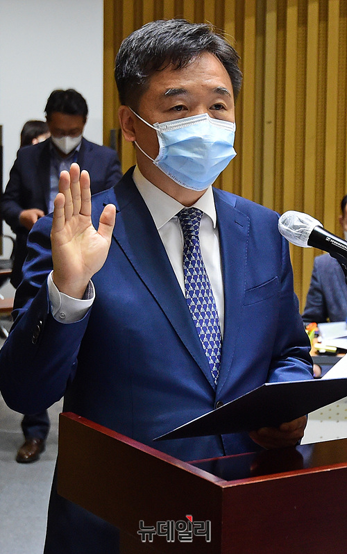 서정협 서울시장 권한대행이 15일 오전 서울 중구 서울시청에서 열린 국회 행정안전위원회의 서울시청에 대한 국정감사에서 선서를 하고 있다.