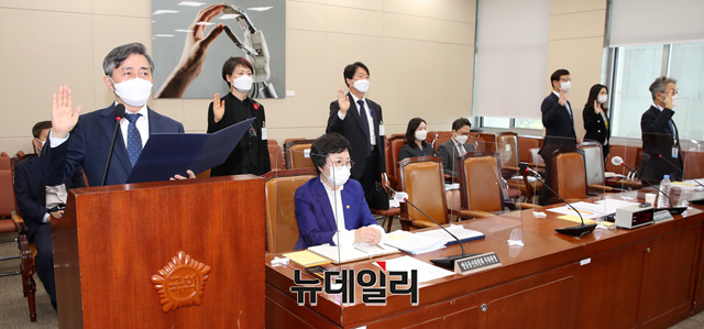양승동 KBS 사장이 15일 오전 국회에서 열린 과학기술정보방송통신위원회의 한국방송공사, 한국교육방송공사에 대한 국정감사에서 증인 선서를 하고 있다. (사진=공동취재단)