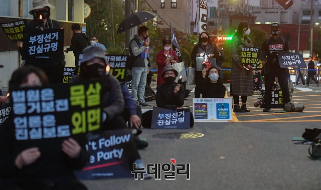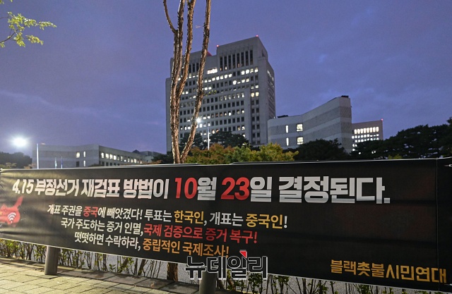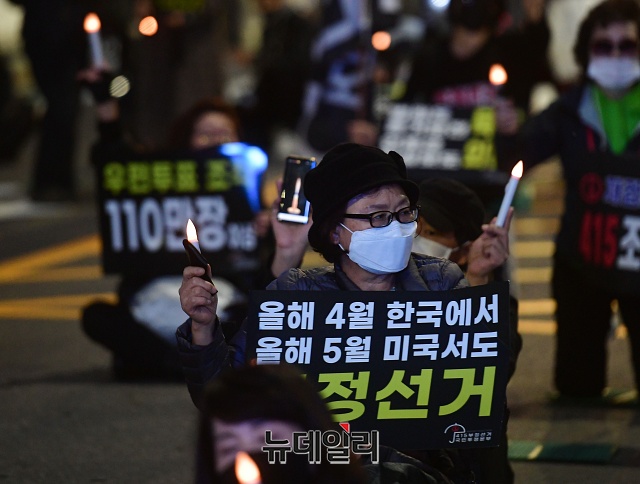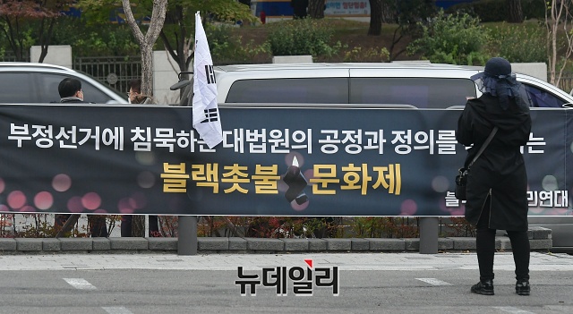 4.15부정선거국민투쟁본부(국투본)가 16일 오후 서울 서초구 대법원 앞에서 4.15총선 부정선거 의혹과 관련해 블랙촛불문화제를 열고, 진실규명을 촉구하고 있다.