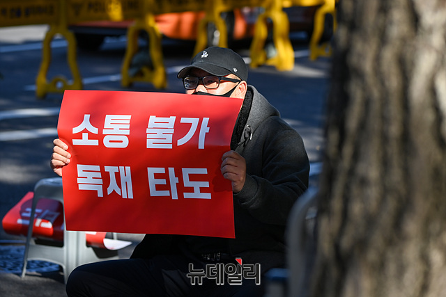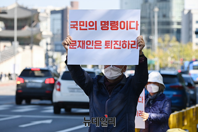 우파단체 자유연대, 국민노동조합 등이 17일 오후 서울 종로구 적선현대빌딩 앞에서 '문재인 퇴진 요구 집회'를 갖고 있다.집회 참석자들은 인적사항과 체온을 기록한 뒤 입장했고, 황색 경계선 안에 설치된 의자에 간격을 띄워 앉았다. 또 '소통 불가 독재 타도' '국민의 명령이다 문재인은 퇴진하라' 등 문구가 기재된 피켓을 들고 집회에 임했다. 인도와 차도 주변에는 경찰력이 배치됐지만 시민과 차량은 평상시처럼 통행할 수 있었다.이날 이동욱 경기의사협회 회장, 이희범 자유연대 대표, 이순임 자유시민당 창당준비위원장, 김정훈 자유민주연합 대표 등이 참석했다.