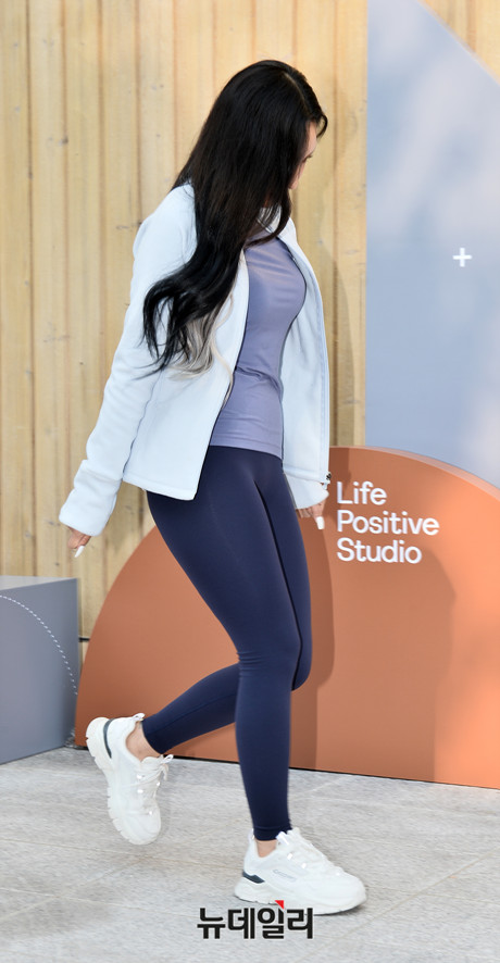 걸그룹 마마무 화사가 19일 오전 서울 종로구 안다르 라이프 파지티브 스튜디오에서 열린 프리오픈 포토월 행사에서 포즈를 취하고 있다.