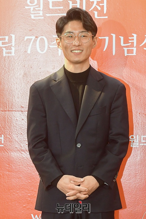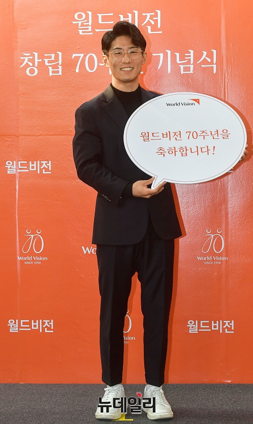 체조선수 양학선이 19일 오후 서울 용산구 백범김구기념관에서 열린 월드비전 창립 70주년 기념식에서 포토타임을 갖고 있다.