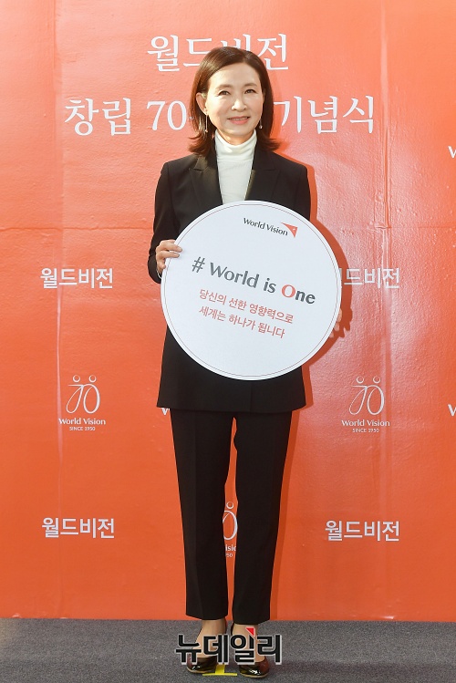 배우 정애리가 19일 오후 서울 용산구 백범김구기념관에서 열린 월드비전 창립 70주년 기념식에서 포토타임을 갖고 있다.