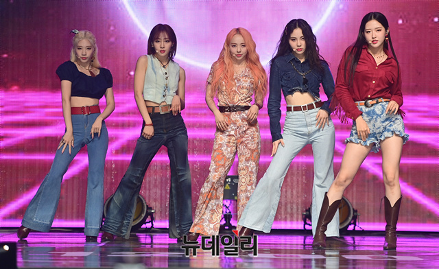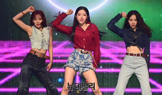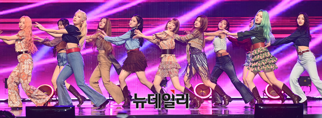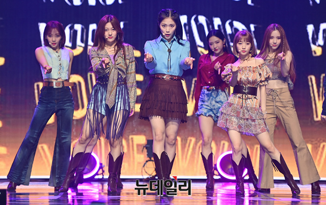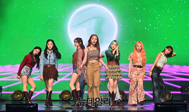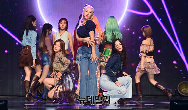 걸그룹 이달의소녀(LOONA)가 19일 오후 서울 용산구 블루스퀘어에서 열린 3번째 미니앨범 '미드나잇(12:00)' 쇼케이스에서 수록곡 '목소리' 무대를 선보이고 있다.