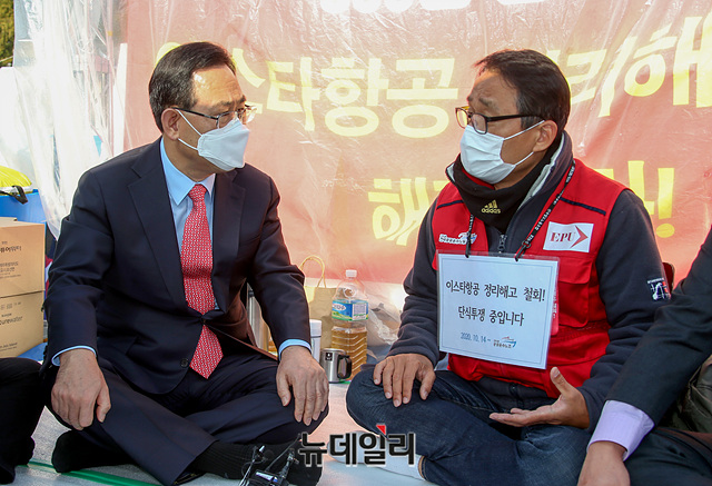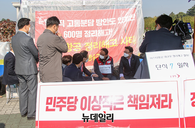 주호영 국민의힘 원내대표, 김성원 원내수석부대표 등이 20일 오전 국회 앞에서 농성중인 박이삼 이스타항공 노조위원장을 찾아 면담을 갖고 있다. (사진=국민의힘)