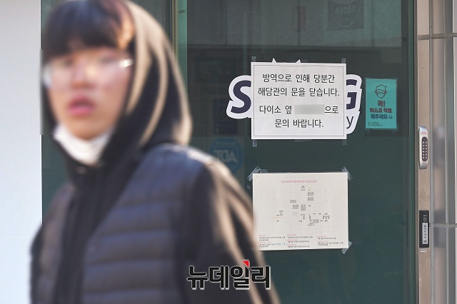 '코로나19(중국 우한 폐렴)' 확진자가 나온 서울 강남구 대치동의 한 학원에 20일 오후 방역 안내문이 붙어 있다.