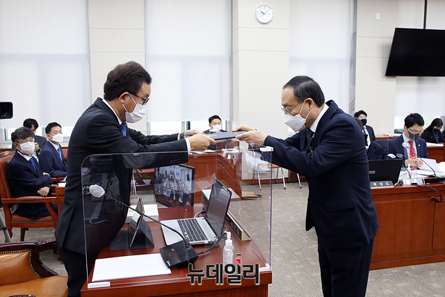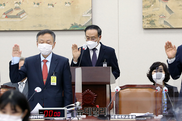 오세정 서울대학교 총장 등 증인들이 22일 오전 국회에서 열린 교육위원회의 서울대학교 등에 대한 국정감사에서 증인 선서하고 있다. (사진=국회사무처)