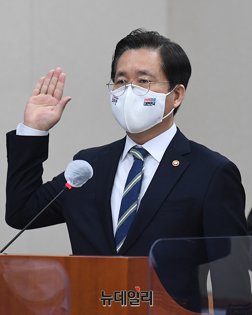성윤모 산업통상자원부장관이 22일 오전 국회 산자위 국정감사에 출석해 증인선서를 하고 있다. (사진=공동취재단)