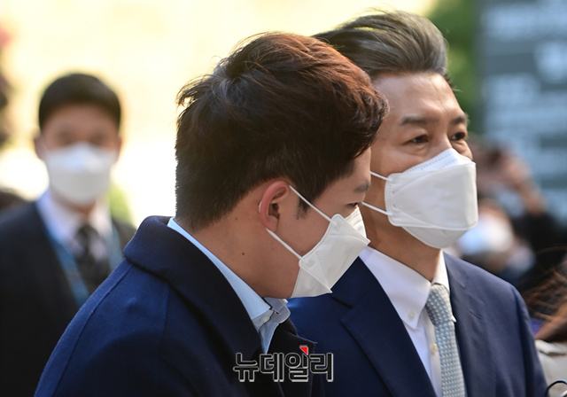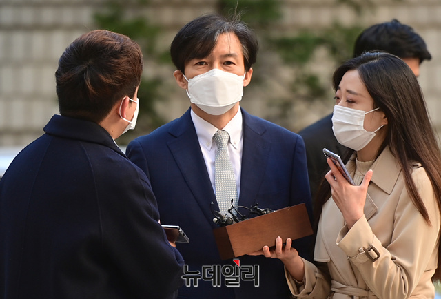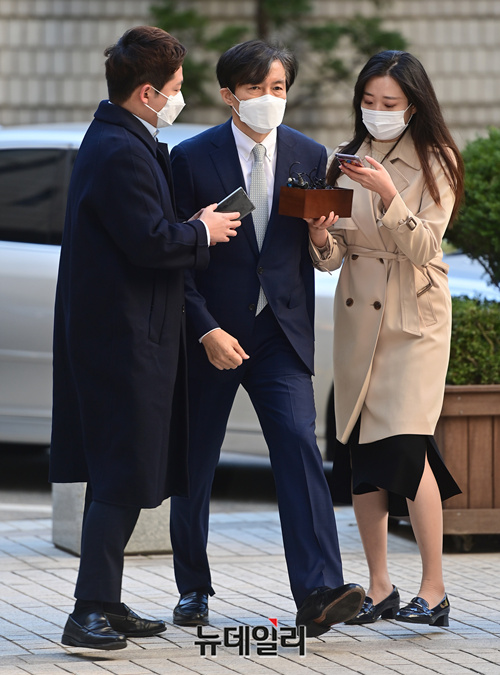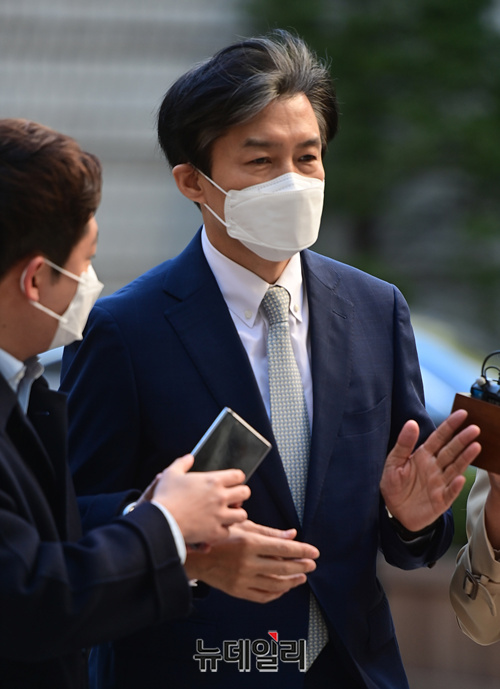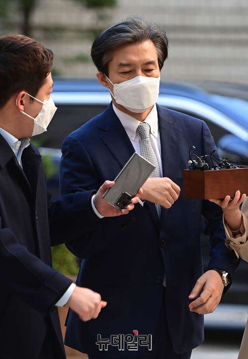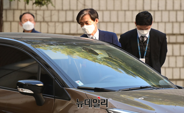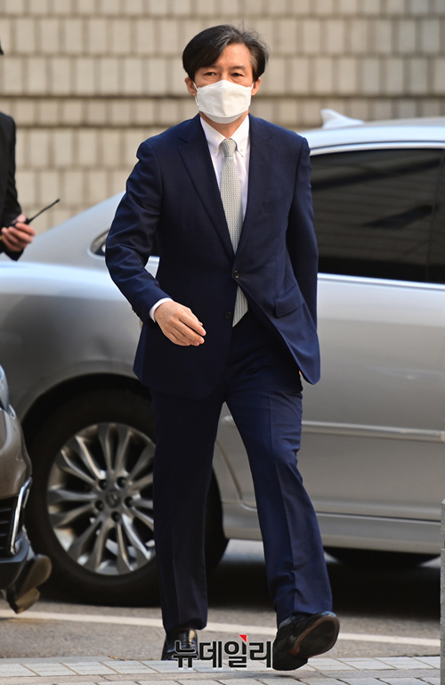 조국 전 법무부 장관이 23일 오전 서울 서초구 서울중앙지법에서 열린 재판에 참석하기 위해 법정으로 입장하고 있다. 이날 재판에는 감찰무마 의혹으로 함께 기소된 백원우 전 청와대 민정비서관과 박형철 전 반부패비서관이 증인으로 출석한다.
