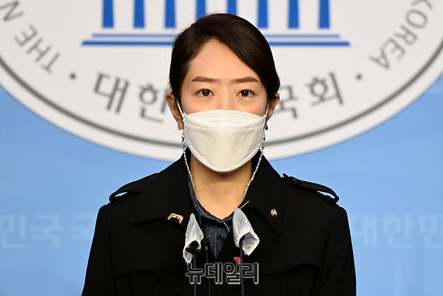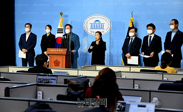 송갑석 더불어민주당 의원, 고민정 의원 등 민주당 산업통상자원중소벤처기업위원회 위원들이 23일 오전 국회 소통관 기자회견장에서 월성1호기 감사원 감사 결과 관련 기자회견을 갖고 있다.
