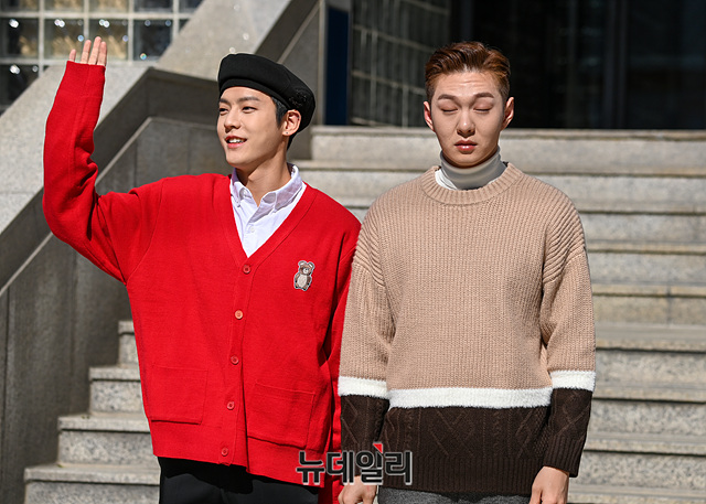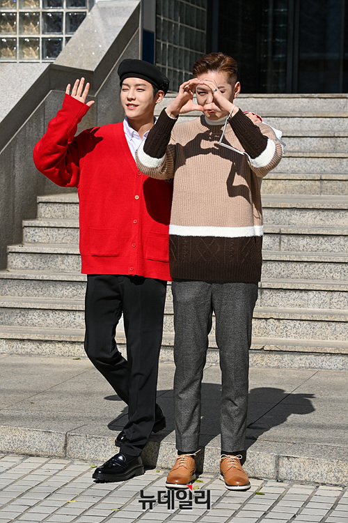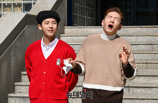아이돌그룹 비투비 이민혁(왼쪽), 이창섭이 23일 오후 서울 강서구 iHQ 미디어에서 진행된 CUBETV 예능 프로그램 '큐브통신' 녹화 전 포토타임을 갖고 있다.
