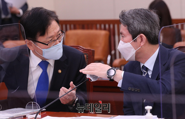 이인영 통일부 장관이 23일 오전 국회에서 열린 통일부ㆍ북한이탈주민지원재단ㆍ남북교류협력지원협회 등 종합감사에 출석해 서호 차관과 대화를 나누고 있다. (사진=공동취재단)