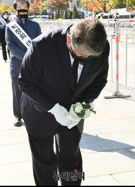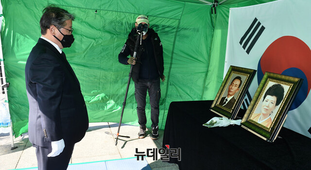 조원진 우리공화당 대표가 24일 오전 서울 종로구 광화문광장에 마련된 '박정희 대통령서거 41주기 추모 분향소'에서 조문을 하고 있다.우리공화당은 지난 23일 오전 0시 30분께 광화문광장에 박정희 전 대통령 분향소 명목의 천막 2개 동을 설치했다. 분향소 운영 기간은 24일부터 박정희 대통령 서거일인 26일 오후 6시까지다.서울시는 코로나 바이러스 감염증 확산 우려로 지난 2월부터 광화문광장 사용 승인을 하지 않고 있다. 서울시는 우리공화당 측에게 26일 자정까지 천막 2개동을 자진 철거 바란다는 계고장을 보낸 상태다.경찰은 광화문광장 인근에 펜스를 둘러치고 분향소를 찾은 시민들이 2m 거리를 유지하도록 통제하는 중이다.이날 우리공화당 측에서 분향소에 화환과 국화꽃 한 송이를 반입하려다 이를 통제하려는 경찰과 승강이를 벌인 끝에 결국 국화꽃 한 송이만 반입됐다.