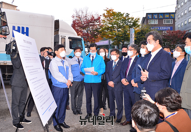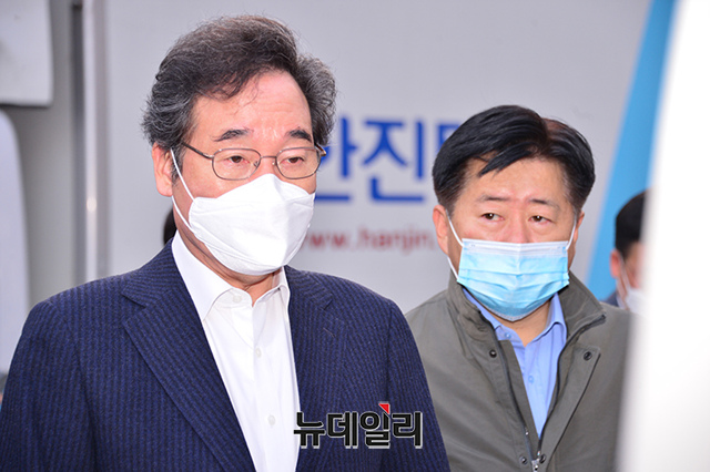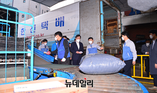 이낙연 더불어민주당 당대표가 27일 오전 서울 마포구 한진택배 신수택배센터에 방문하여 택배기사 근로실태 점검 및 보호대책에 대한 현장간담회를 하고 있다.(사진=더불어민주당)