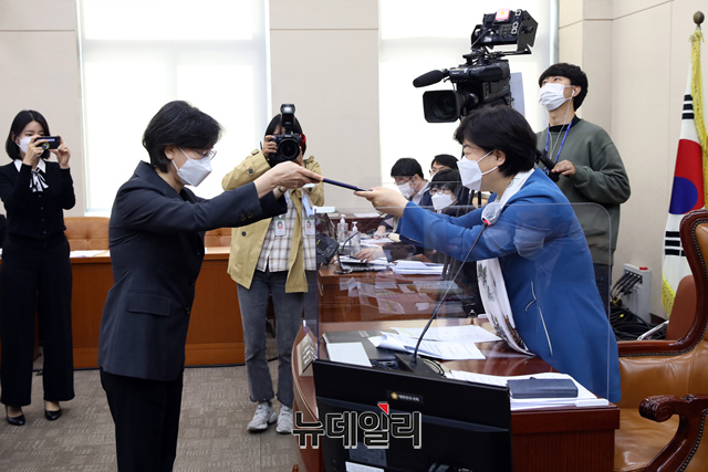 노정희 중앙선거관리위원 후보자가 27일 오전 국회에서 열린 인사청문회에 출석해 선서를 하고 있다. (사진=국회사무처)
