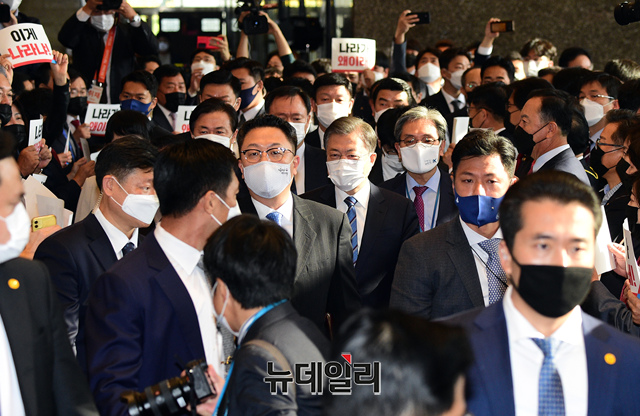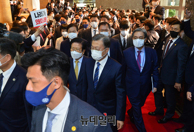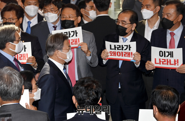 이날 국민의힘 소속 의원들은 문 대통령에게 라임·옵티머스 자산운용펀드 사건에 대한 특검을 요구하는 피켓 시위를 진행 했다.(사진=공동취재단)