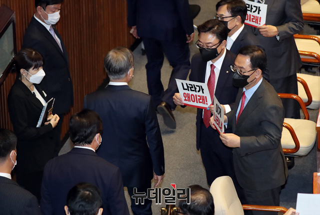 국민의힘 의원들이 28일 국회 본회의장에서 열린 문재인 대통령 예산안 관련 시정연설이 끝난 뒤 퇴장하는 문 대통령에게 손피켓을 들어보이고있다. (사진=공동취재단)