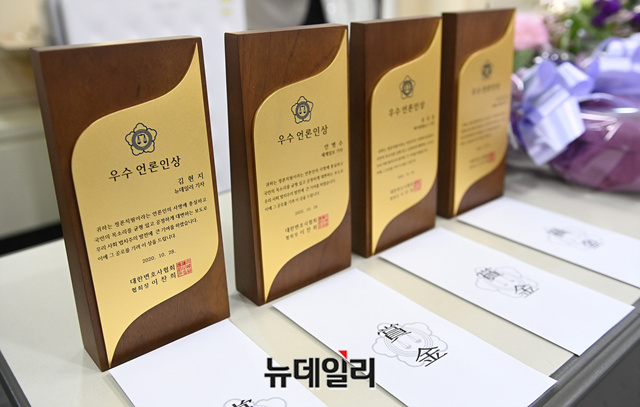 이찬희 대한변호사협회장과 2020년도 대한변호사협회 우수언론인상 수상자들이 28일 오전 서울 강남구 대한변협회관 대강당에서 열린 시상식에서 기념촬영을 하고 있다.올해 수상자는 △고동욱(연합뉴스) △김현지(뉴데일리) △안병수(세계일보) △유선준(파이낸셜뉴스) △좌영길(헤럴드 경제) 기자 등 5명이다.대한변호사협회는 매년 2차례 객관적이고 공정한 시선을 통한 보도활동으로 건전한 사회문화 창달에 공헌한 언론인을 선정해 우수언론인상을 시상하고 있다.