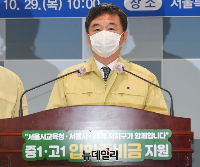 서정협 서울시장 권한대행이 29일 오전 서울 종로구 서울시교육청에서 열린 중고생 입학준비금 지원 기자회견에서 발언을 하고 있다.