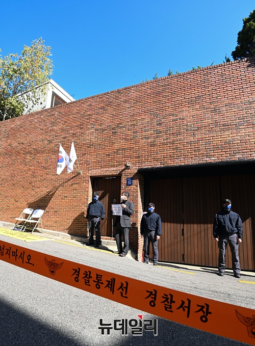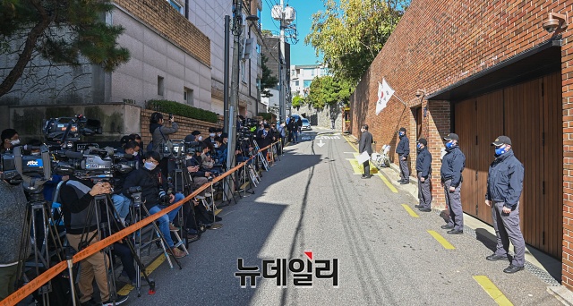 대법원이 이병박 전 대통령에 징역 17년을 선고한 29일 오후 서울 강남구 이 전 대통령 자택 앞에 취재진들이 대거 몰렸다.