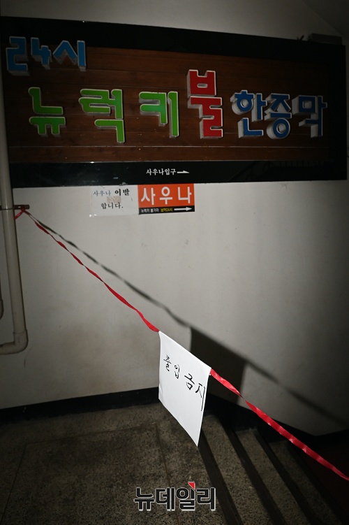 '코로나19(중국 우한 폐렴)' 확진자가 대거 발생한 서울 강남구 럭키사우나 입구에 29일 오후 출입금지를 알리는 안내문이 붙어있다.
