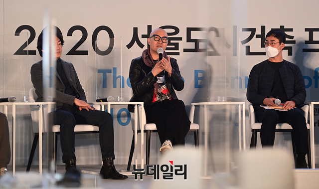 방송인 홍석천이 30일 오후 서울 중구 서울도시건축전시관 비움홀에서 열린 '2020 서울도시건축 프리비엔날레'에서 발언하고 있다.