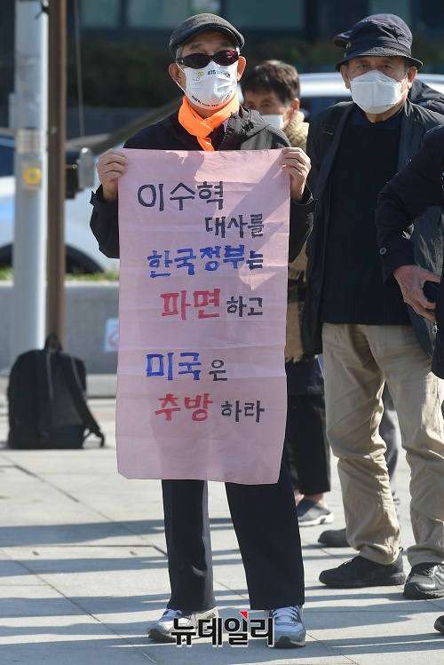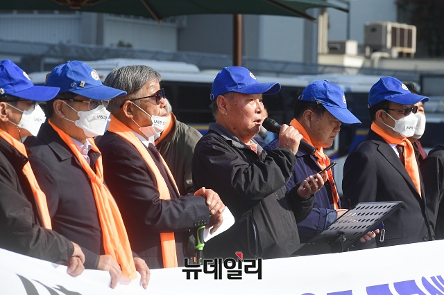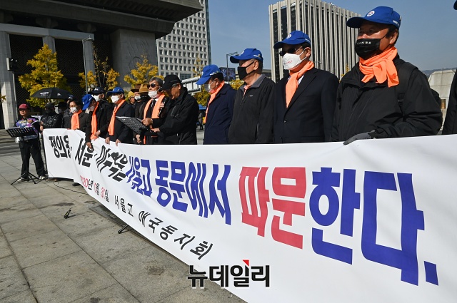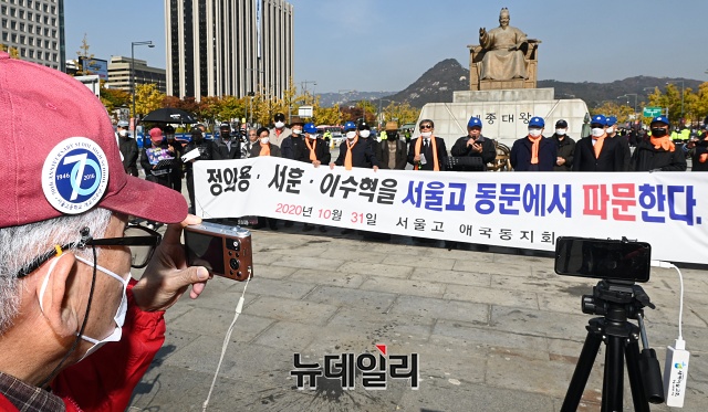 서울고등학교 애국동지회가 31일 오전 서울 종로구 광화문광장에서 '서울고 출신 정의용, 서훈, 이수혁 동문 파문 기자회견'을 갖고 있다.이들은 "북핵의 공포, 한미동맹의 약화 속에 국민들은 안보 불안 속에 살고 있다"며 "이렇게 된 데에는 문재인과 주사파 외에도 고위공무원들인 정의용, 서훈, 이수혁 서울고 출신 3인방이 있다"고 말했다.이어 "서울고의 교육을 자신의 출세라는 이기적인 목적에 사용했으므로, 서훈 국가안보실장, 정의용 전 국가안보실장, 이수혁 주미대사를 고교동문회에서 파문하고 의절한다"고 밝혔다.