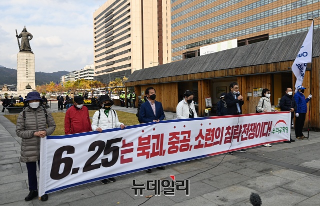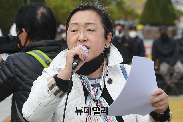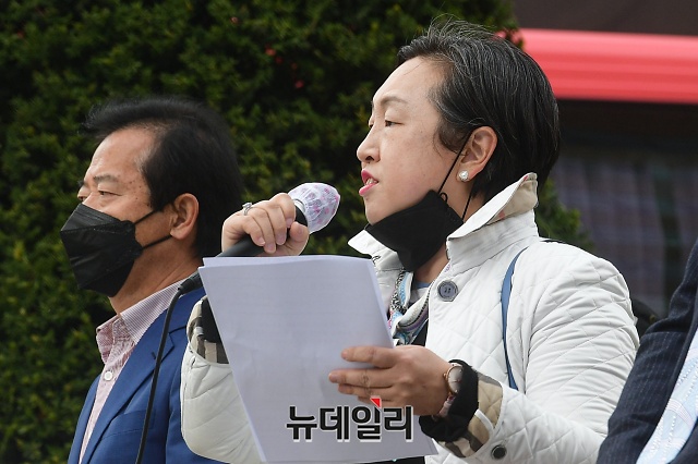 인지연 우리공화당 최고위원이 31일 오후 서울 종로구 광화문광장에서 열린 '중국의 6·25 침략역사 왜곡 규탄 및 문재인 친중정권 규탄 기자회견'에서 발언하고 있다.