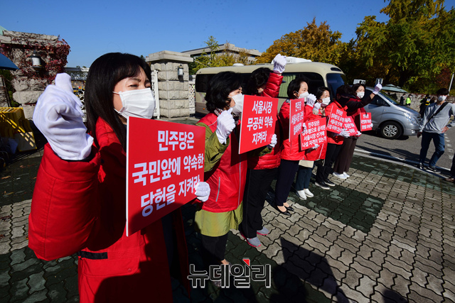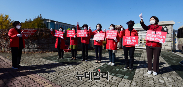 국민의힘 서울시당 여성위원회가 2일 오후 국회 앞에서 더불어민주당의 서울시장 공천철회를 촉구 피켓시위를 하고 있다.