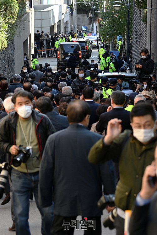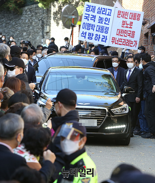 횡령과 뇌물 수수 혐의 등으로 징역 17년형이 확정돼 동부구치소에 재수감되는 이명박 전 대통령이 2일 오후 서울중앙지검 출석을 위해 논현동 자택을 나서고 있다. 이날 이재오 전 의원, 장제원·권성동 국민의힘 의원 등의 응원을 받으며 자택을 나섰다.