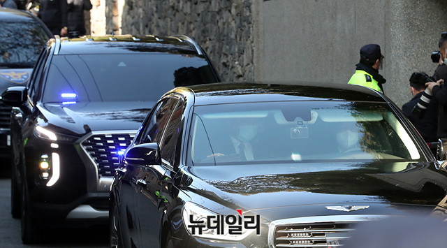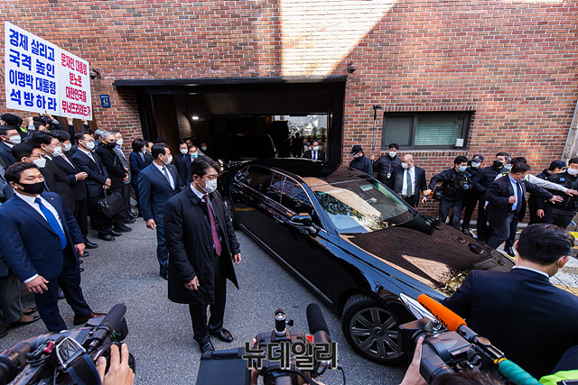 횡령과 뇌물 수수 혐의 등으로 징역 17년형이 확정돼 동부구치소에 재수감되는 이명박 전 대통령이 2일 오후 서울중앙지검 출석을 위해 논현동 자택을 나서고 있다. 이날 이재오 전 의원, 장제원·권성동 국민의힘 의원 등의 응원을 받으며 자택을 나섰다.