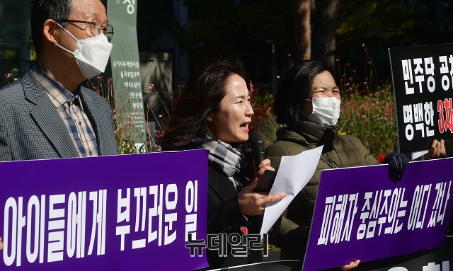 박소영 교육바로세우기운동본부 대표가 3일 오후 서울 중구 서울시청 앞에서 열린 민주당 후보 공천 규탄 기자회견에서 발언하고 있다.