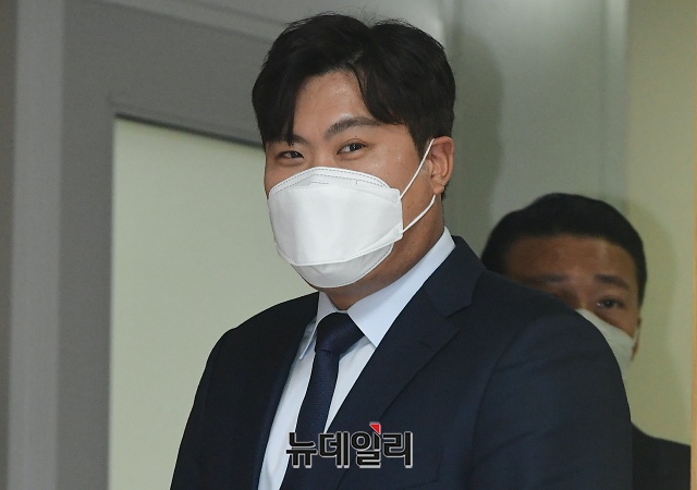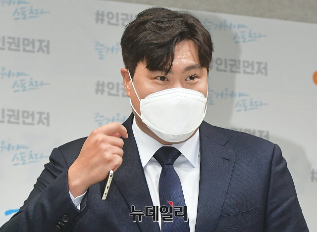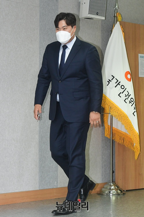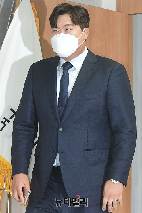 메이저리거 류현진이 3일 오후 서울 중구 국가인권위원회에서 열린 기자회견장에 입장하고 있다.