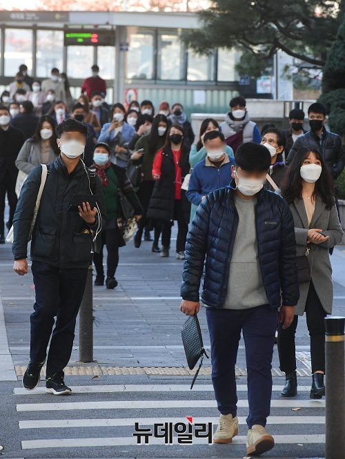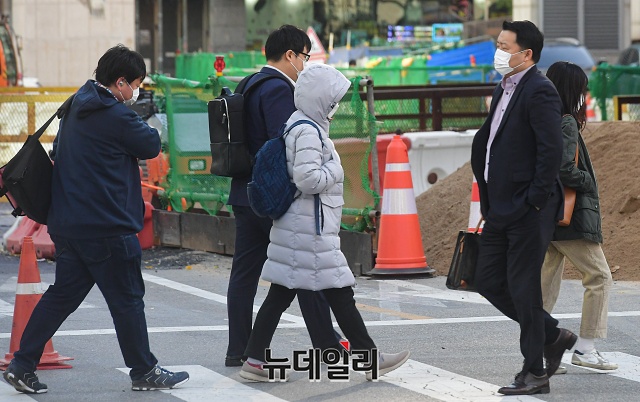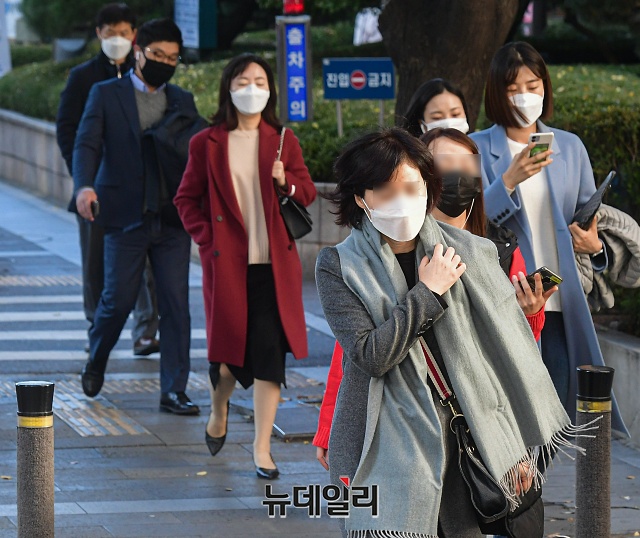 서울 아침기온이 영하 1도로 올 가을 들어 첫 영하권까지 내려간 4일 오전 서울 여의도 인근에서 직장인들이 패딩을 입고 출근하고 있다.