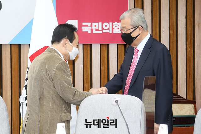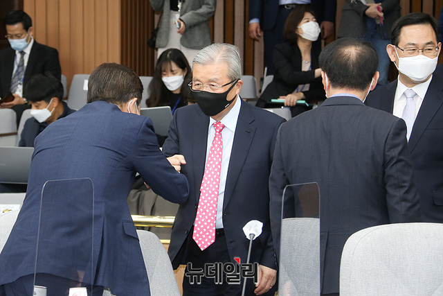 김종인 국민의힘 비상대책위원장, 주호영 원내대표 등 지도부가 4일 오전 국회에서 열린 확대당직자회의에 입장하고 있다. (사진=국민의힘)