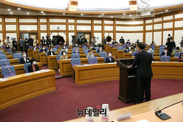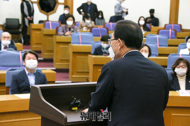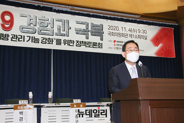 주호영 국민의힘 원내대표가 4일 오전 국회 의원회관에서 열린 코로나19 경험과 극복 '질병 관리 기능 강화'를 위한 정책토론회에서 인사말을 하고 있다. 최연숙 국민의힘 의원이 주최한 이번 토론회는 안철수 국민의당 대표 등이 참석했다. (사진=국민의힘)