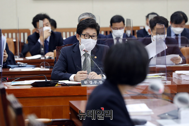 조명래 환경부 장관이 5일 오전 국회에서 열린 환경노동위원회 전체회의에서 의원들의 질의에 답변하고 있다.(사진=국회사무처)