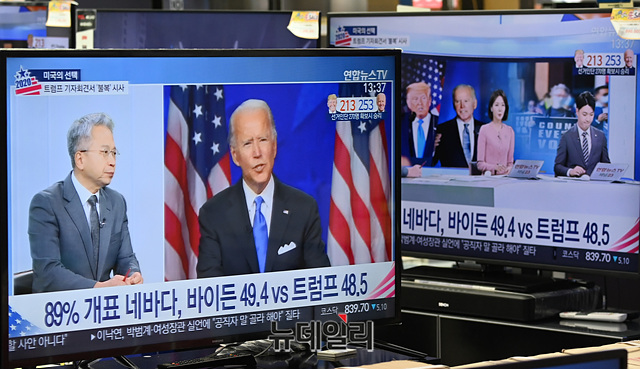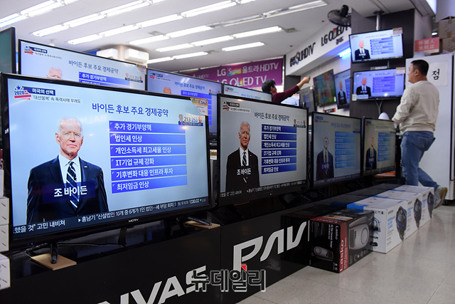 2020 미국 대선 개표가 이어지는 6일 오후 서울 용산구 전자랜드의 한 매장에 설치된 TV 화면에 미국 대선 개표 뉴스가 방송되고 있다.현재 트럼프 대통령보다 바이든 후보가 유리한 전세다. 바이든은 현재 총253석의 선거인단을 확보한 상태다.이날 트럼프 미국 대통령은 "연방대법원에서 당선이 가려질 수 있다"며 사실상 대선불복 선언을 했다. 바이든 후보 측은 대통령직 인수위원회 홈페이지를 개설하고 기후협약 복귀 의사를 밝히는 등 사실상 당선을 선언했다.