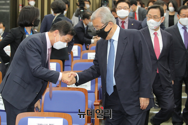 김종인 국민의힘 비상대책위원장과 주호영 원내대표가 6일 오전 국회에서 열린 의원총회에서 모두발언을 하고 있다. (사진=국민의힘)