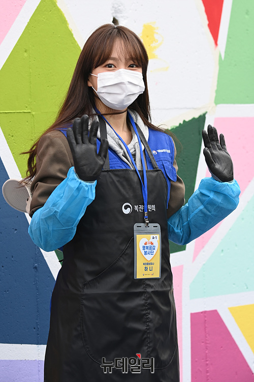 가수 하니가 6일 오후 서울 구로구 구로역 인근 공구상가 지역 철길 거주지에서 열린 '제13기 행복공감봉사단 2차 봉사활동'에 참석하고 있다.