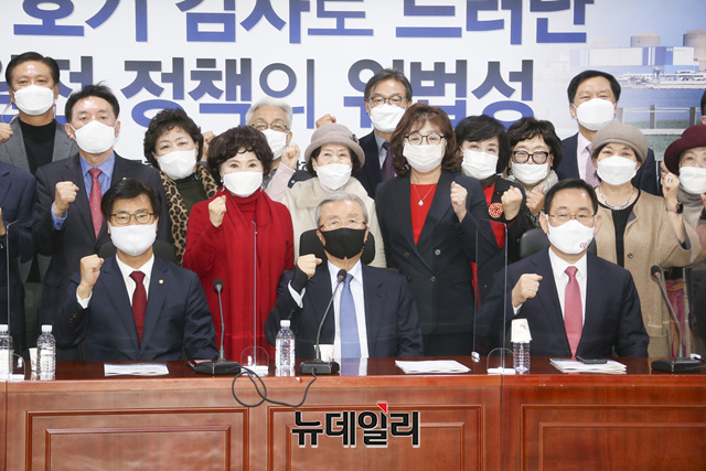 김종인 국민의힘 비대위원장, 주호영 원내대표 등이 6일 오전 국회 의원회관에서 열린 김영식 의원 주최 원자력 바로 알리기 전국 릴레이 특강에 참석해 기념사진을 촬영하고 있다. (사진=국민의힘)