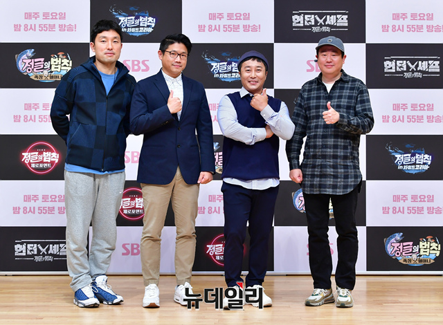 개그맨 김병만, 김준수·김진호·박용우 PD가 9일 오후 온라인으로 진행된 SBS 예능 프로그램 '정글의 법칙' 국내 편 기자간담회에 참석해 포토타임을 갖고 있다.