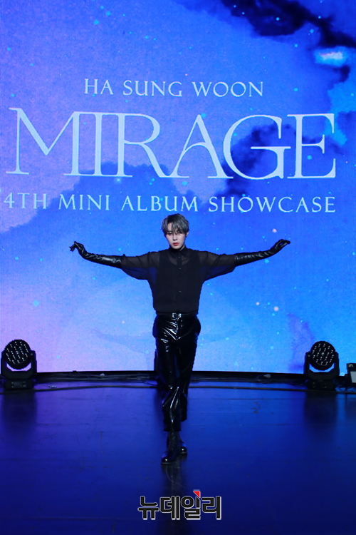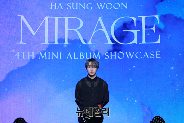 프로젝트 그룹 워너원 출신 가수 하성운이 9일 오후 온라인으로 진행된 네 번째 미니앨범 '미라지' 쇼케이스에서 포토타임을 갖고 있다.