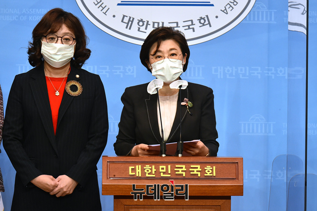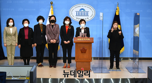 김정재 국민의힘 의원 등 여성가족위원회 소속 의원들이 10일 오전 국회 소통관에서 기자회견을 갖고 이정옥 여성가족부 장관의 '재보선, 성인지 집단학습 기회' 발언에 대해 사퇴를 촉구 하는 기자회견을 갖고 있다.